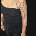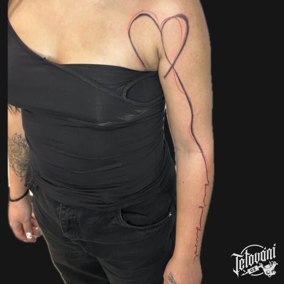 Tetování abstraktní čáry, srdce a nápis na rukávu