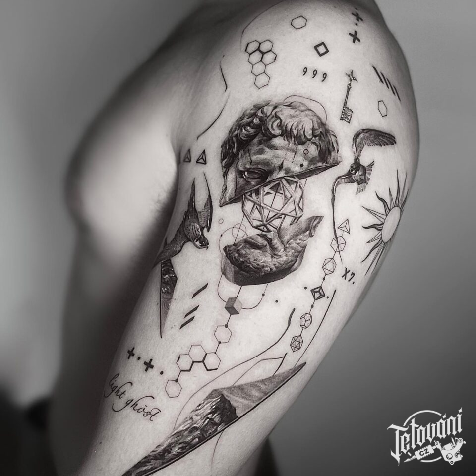 Tetování abstraktní portrét na rameni