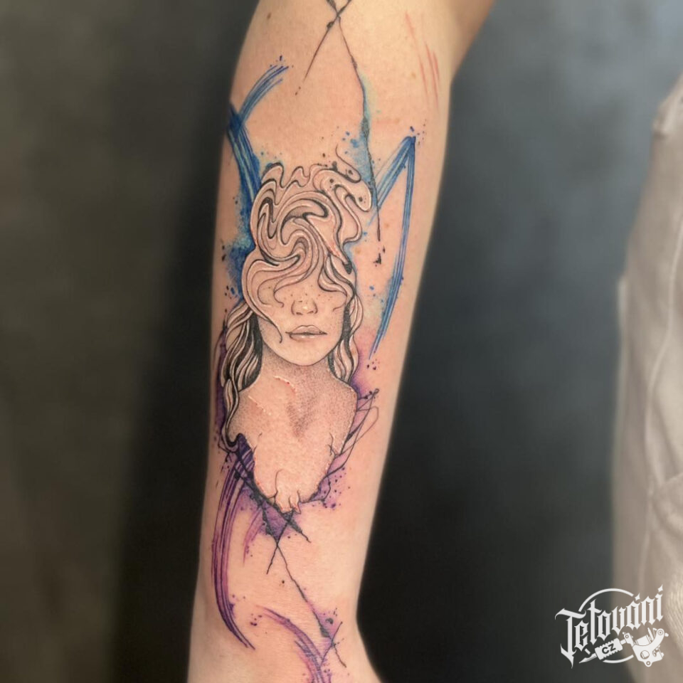 Tetování abstraktní portrét ženy na předloktí