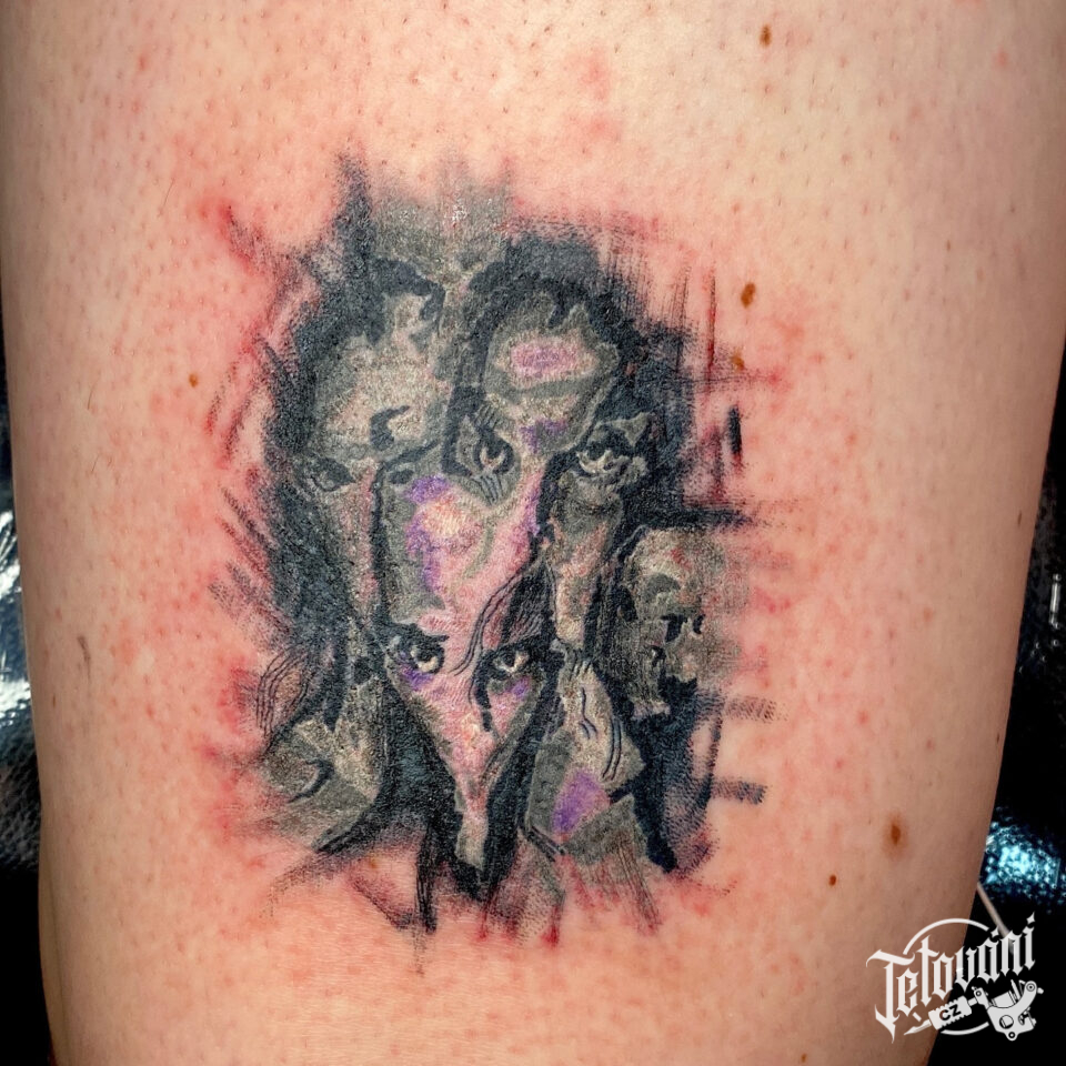 Tetování abstraktní portréty na stehně