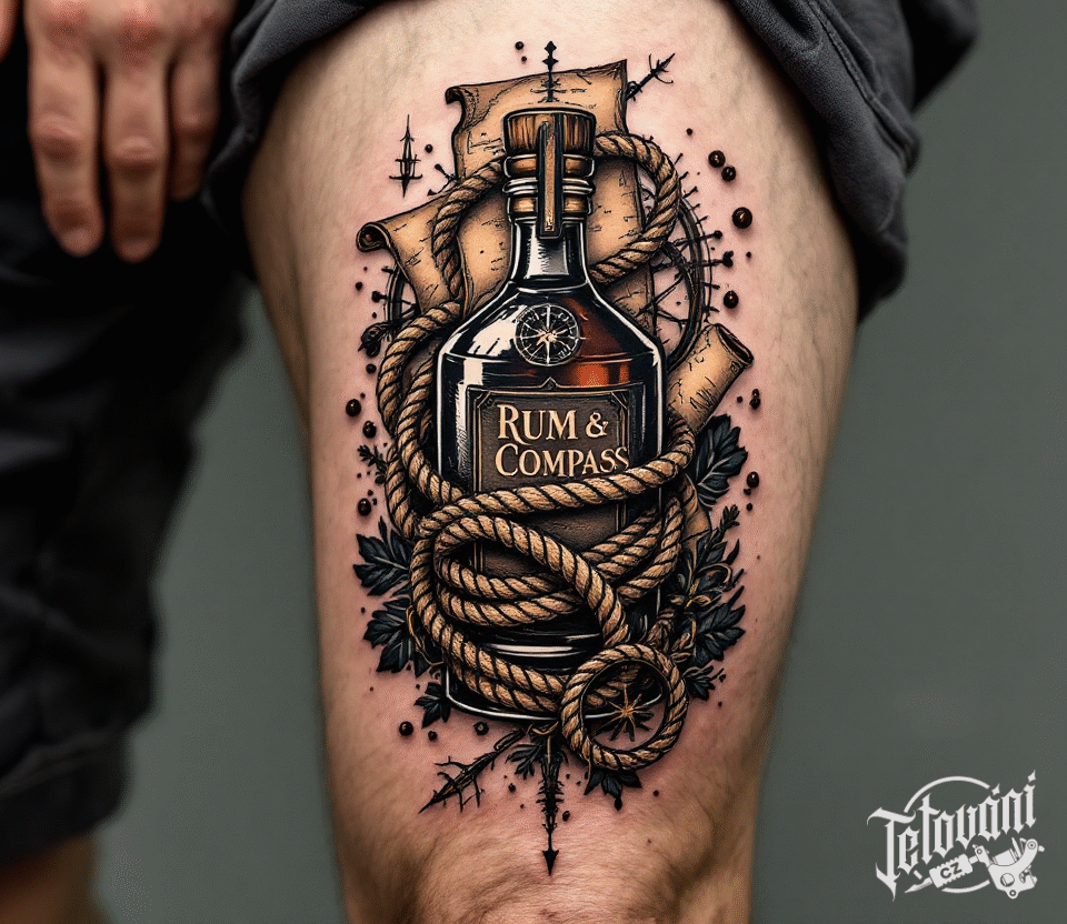 Tetování alkohol, předměty, láhev rumu na stehně