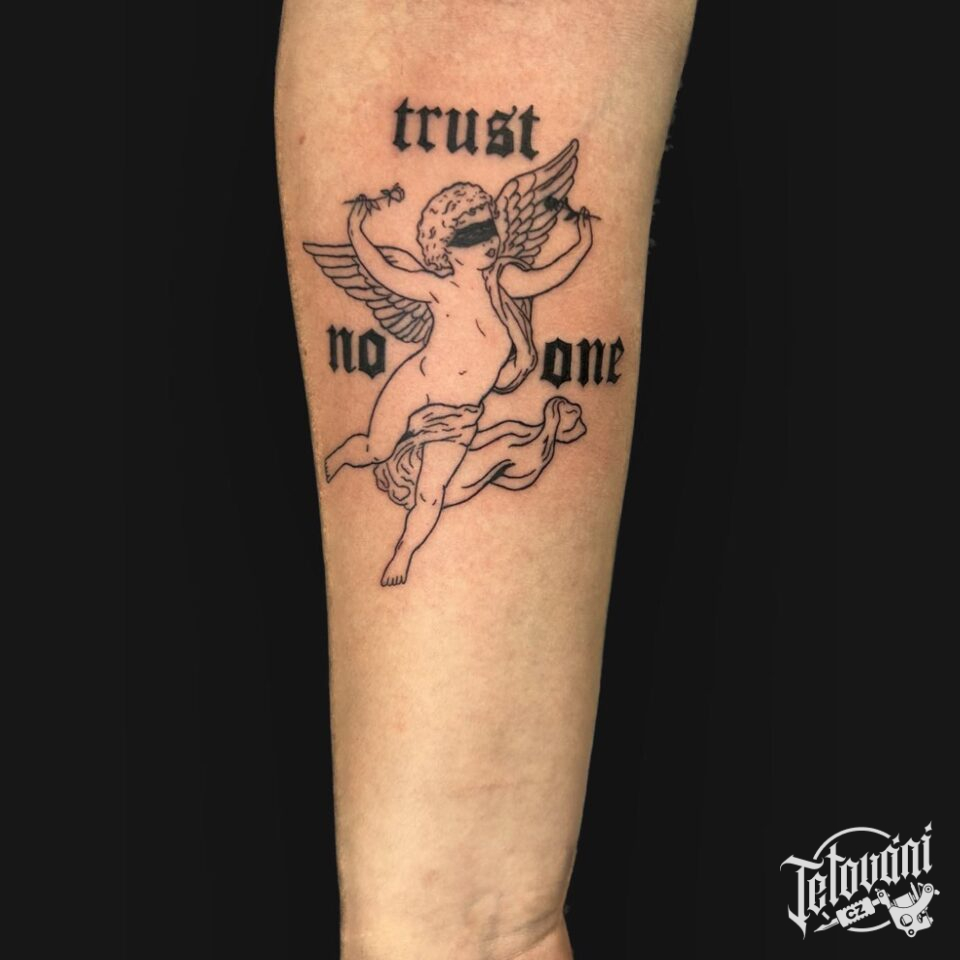 Tetování anděl a nápis na předloktí