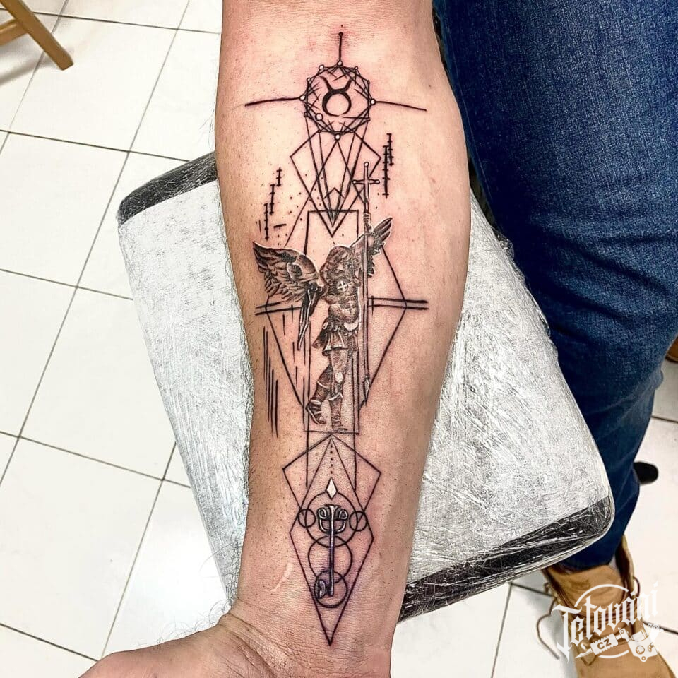 Tetování anděl a ornamenty na předloktí