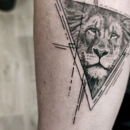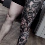 Tetování anděl, lebka, lev, portrét na noze