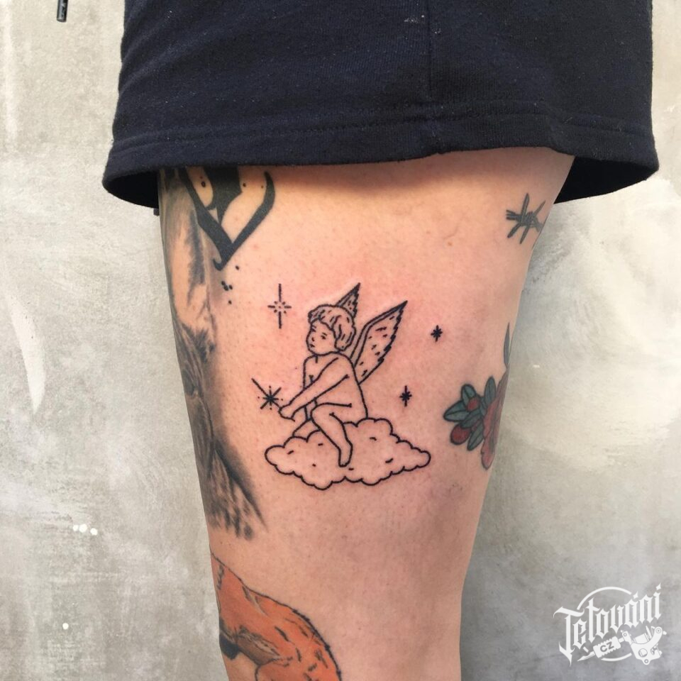 Tetování anděl na boku stehna