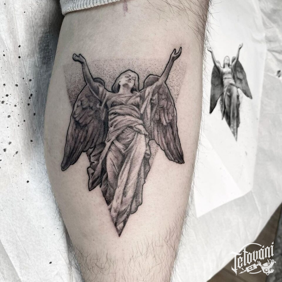 Tetování anděl na lýtku