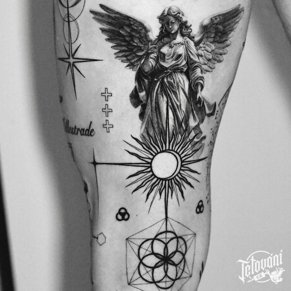Tetování anděl na stehně