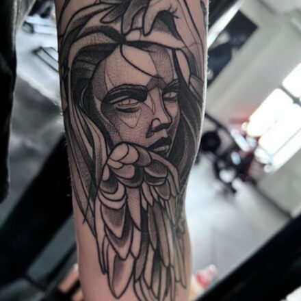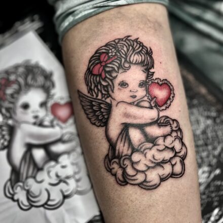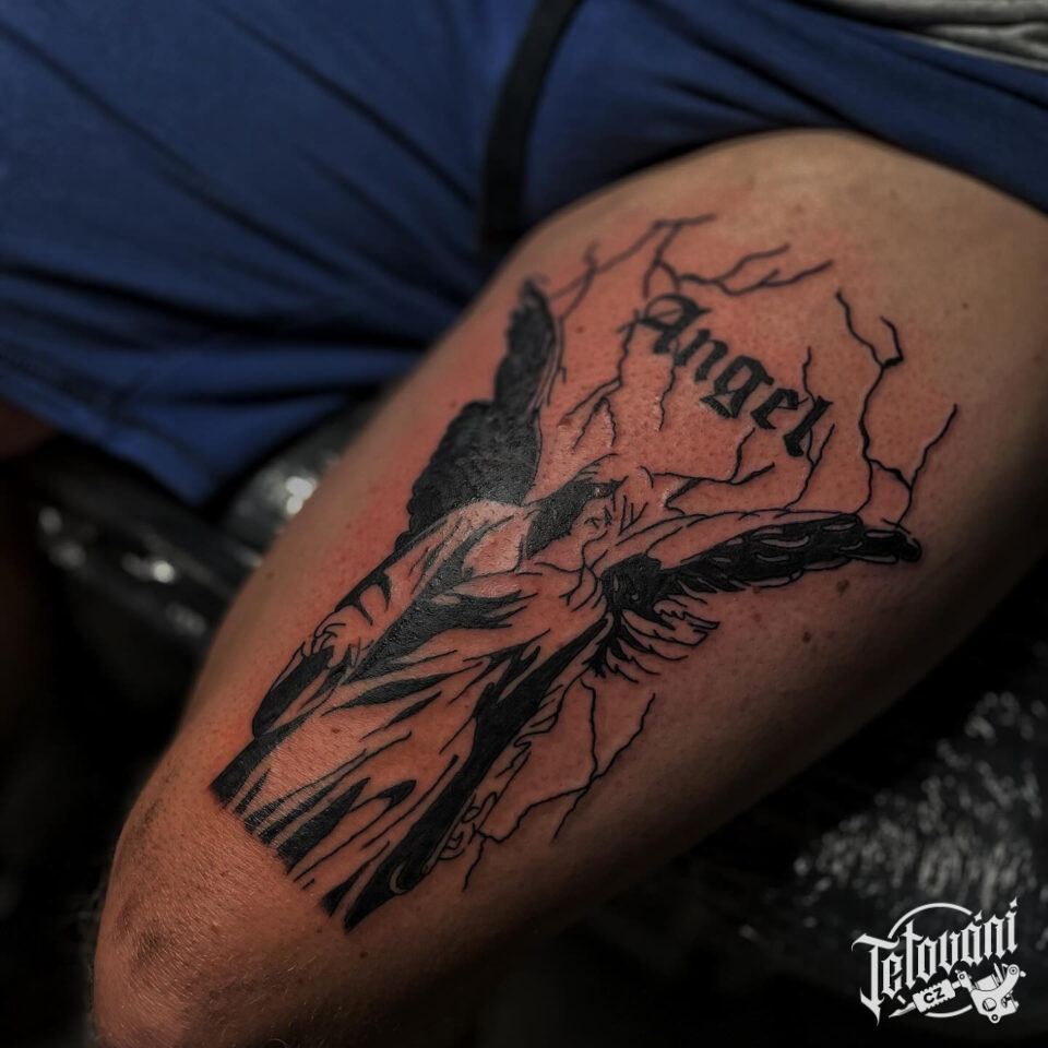 Tetování anděl na stehně