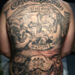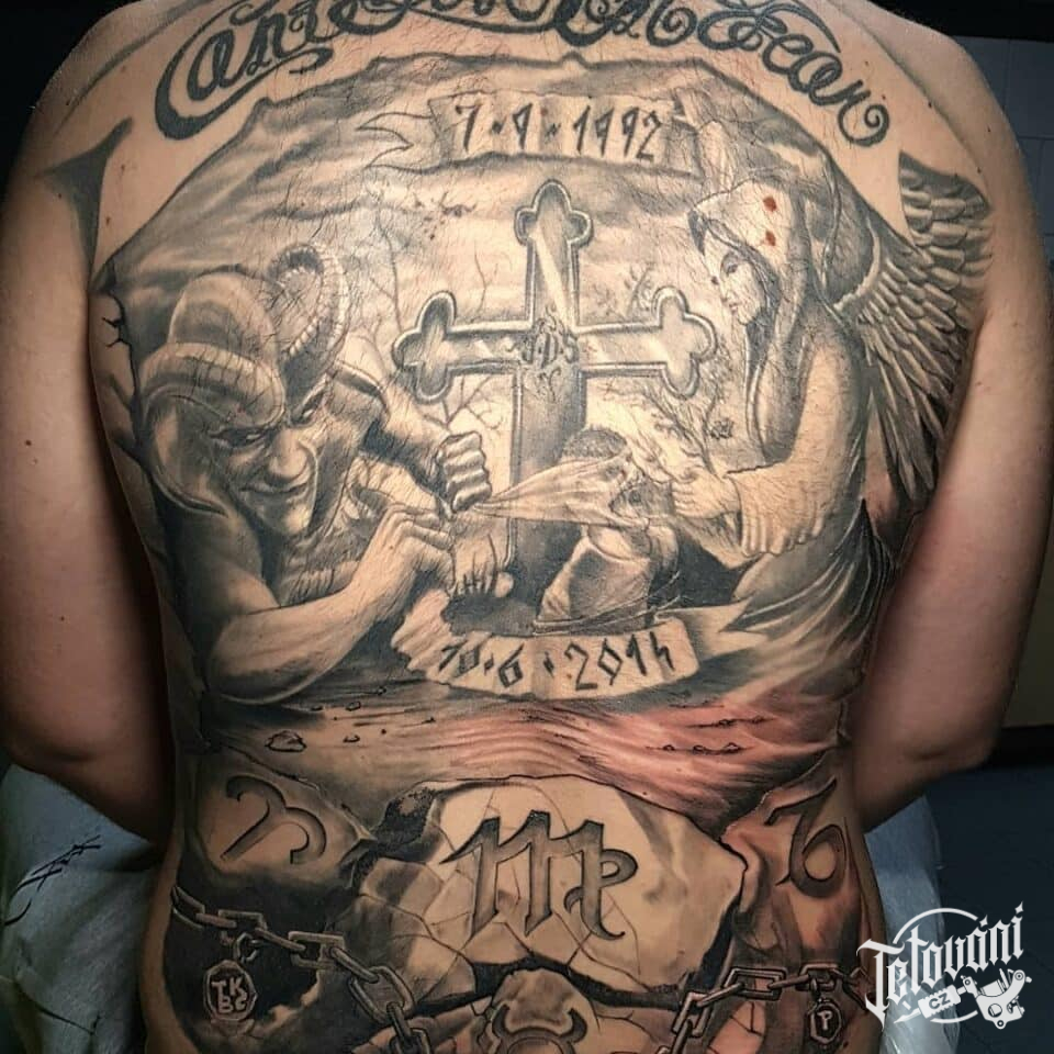 Tetování anděl s ďáblem, kříž, znamení zvěrokruhu na zádech