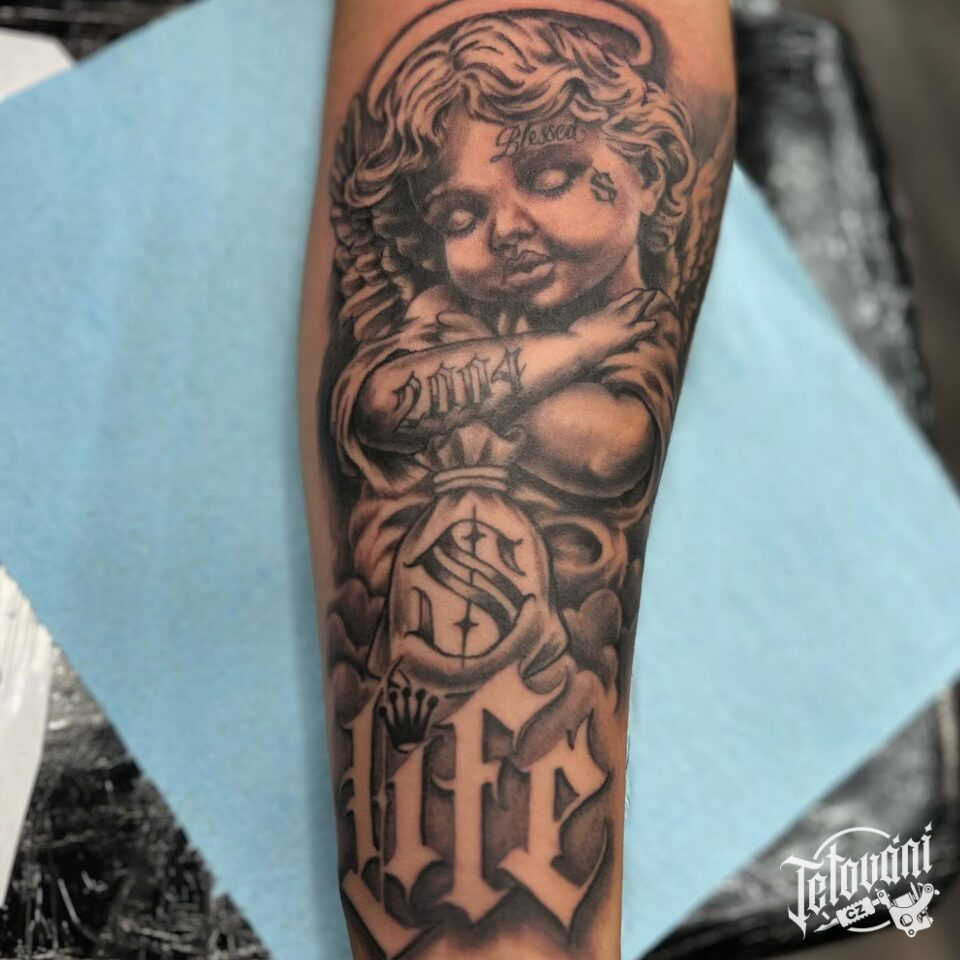 Tetování anděl s nápisem na předloktí