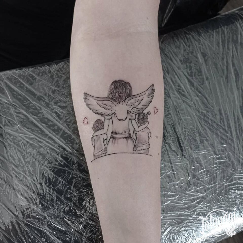Tetování anděl žena, anděl strážný, rodina, děti na předloktí