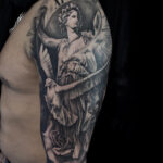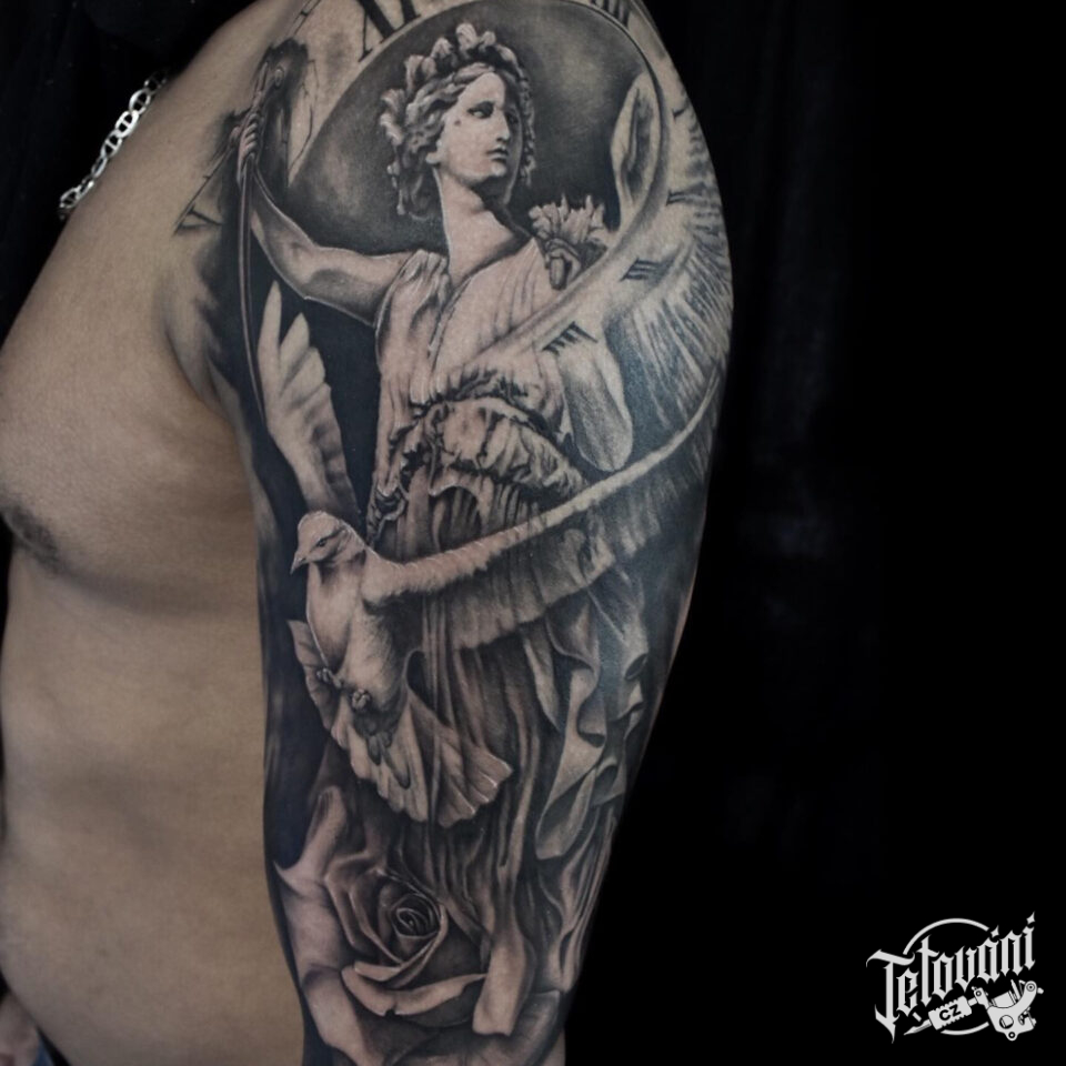 Tetování anděl, zvíře holubice a květina růže na rameno