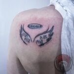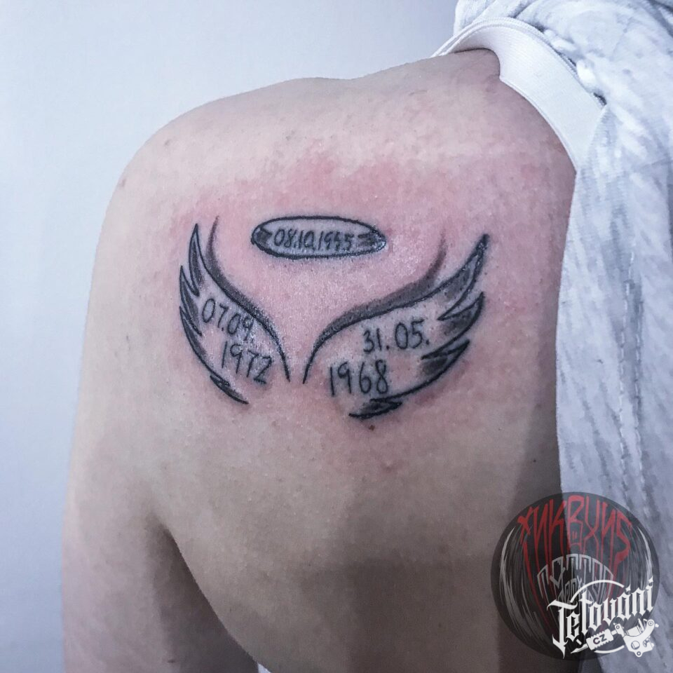 Tetování andělské křídla a datumy na lopatce