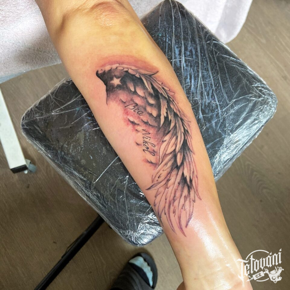 Tetování andělské křídlo se jmény na předloktí