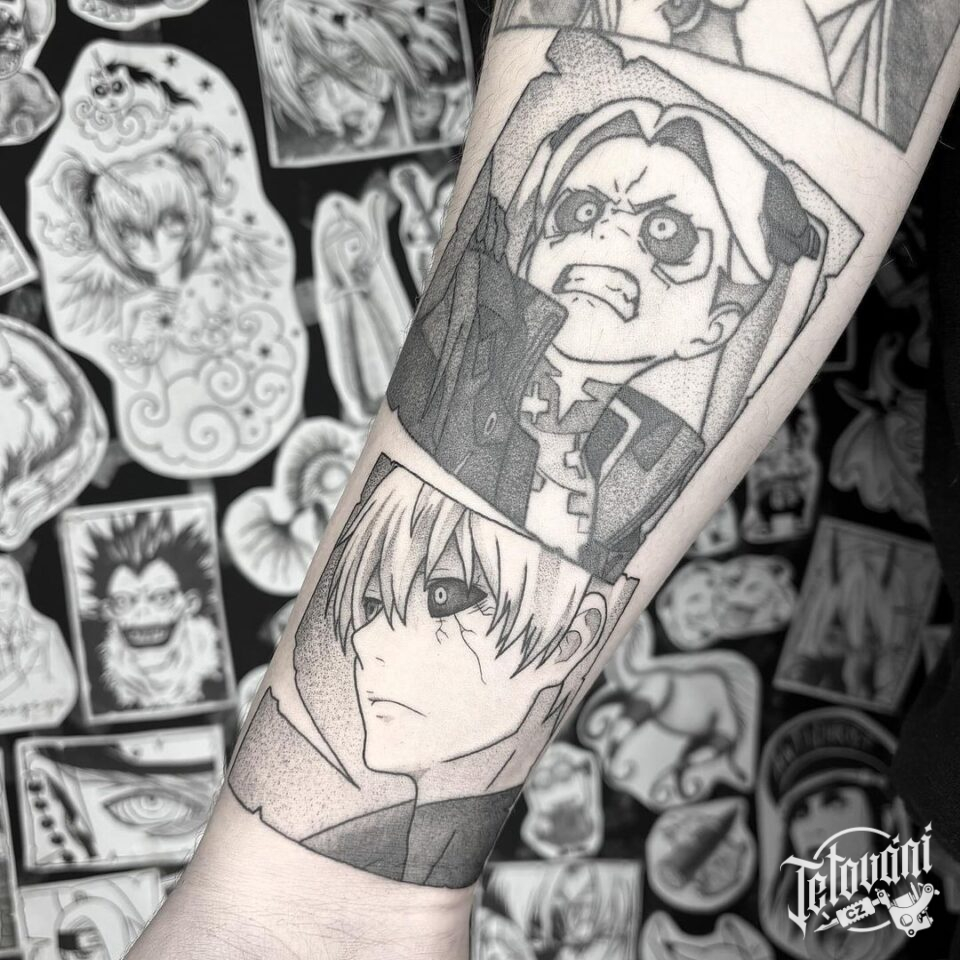Tetování anima postavička, portrét, žena Kaneki Ken a Rebecca na předloktí
