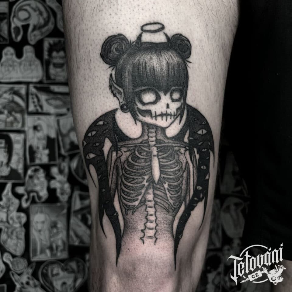 Tetování anime kostlivec s křídly na stehno