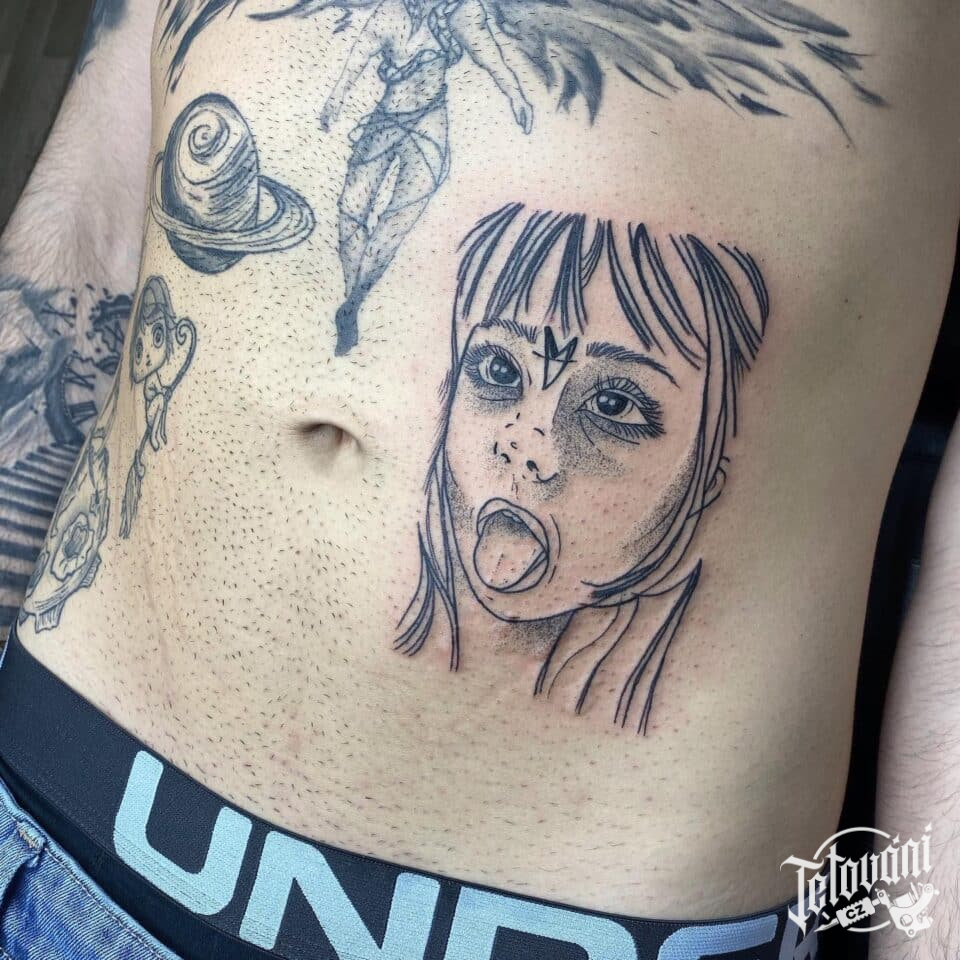 Tetování anime postavička, srdce na břicho
