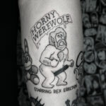 Tetování anime postavičky z filmů a pohádek, nápis na lýtko