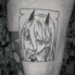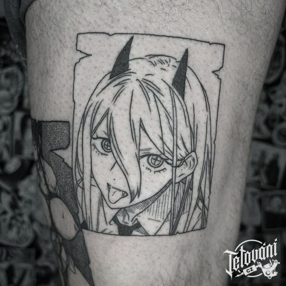 Tetování anime žena, portrét Power – Chainsaw man na bok stehna