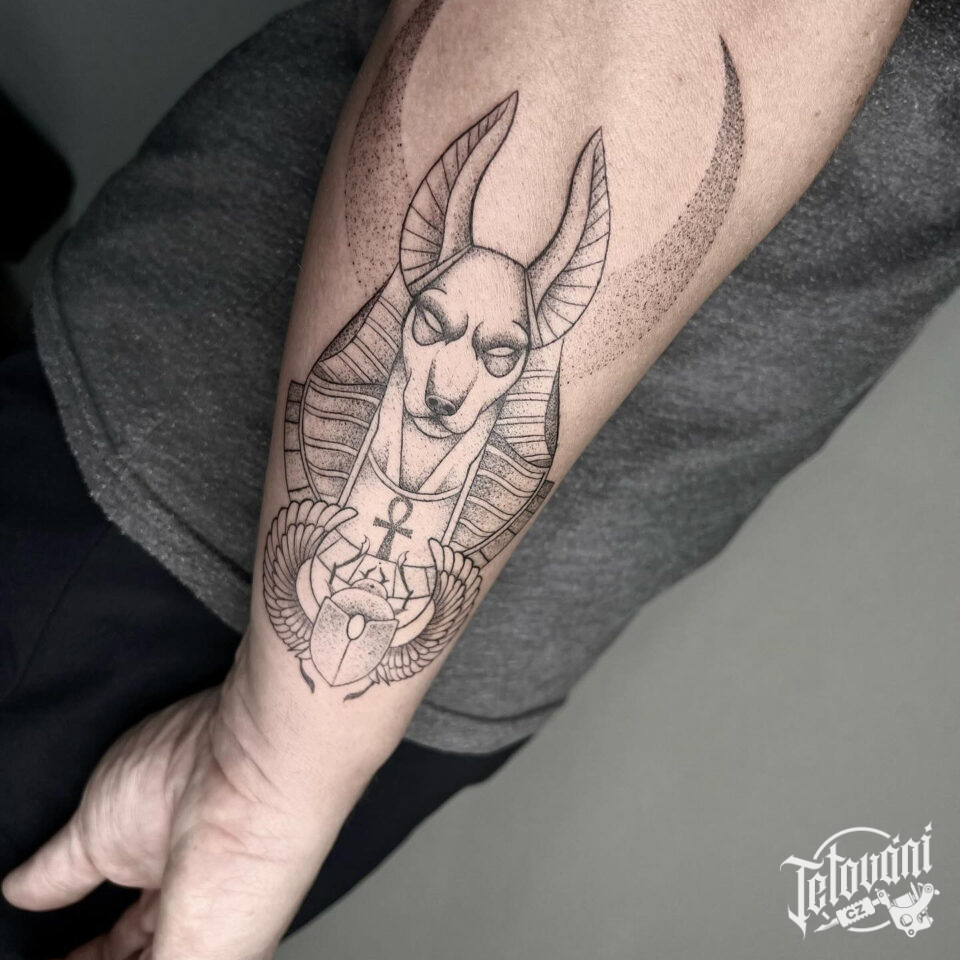 Tetování Anubis, egyptská mytologie na předloktí