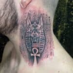 Tetování Anubis, nilský kříž a znaky a symboly na krku