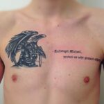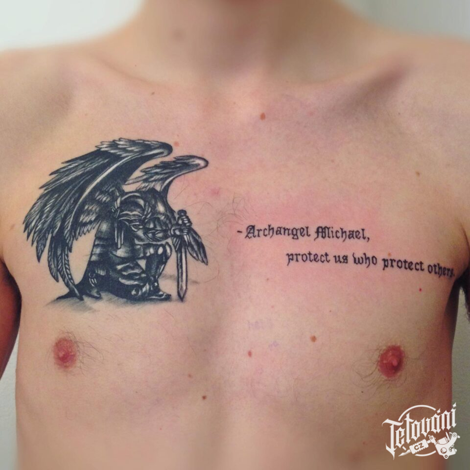 Tetování archanděl a nápis na prsa