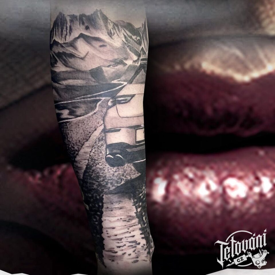 Tetování auto v přírodě hory cesta na lýtku
