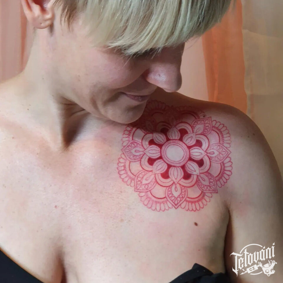 Tetování barevná mandala, mandala štěstí pod klíční kost
