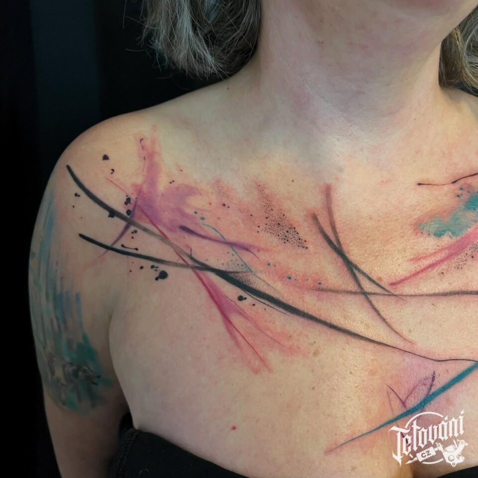 Tetování barevné abstraktní čáry na hrudník