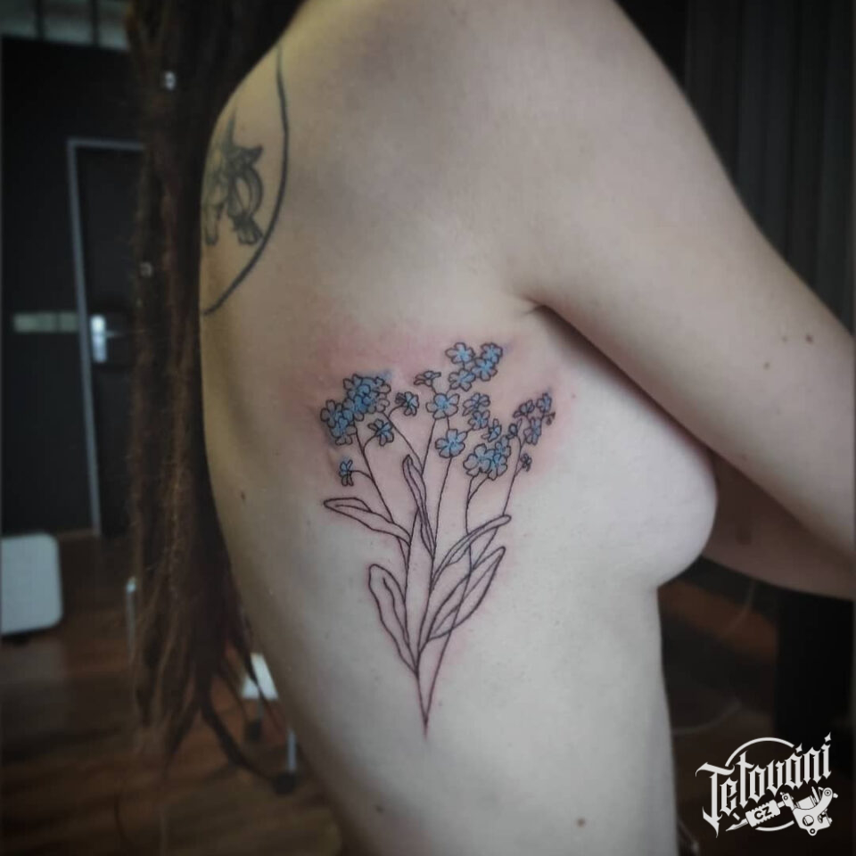 Tetování barevné květiny, pomněnky na žebra