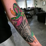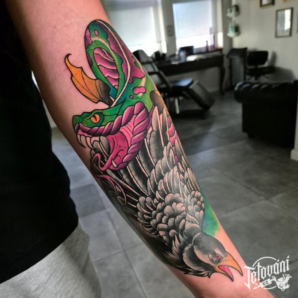 Tetování barevný had a vrána a předloktí