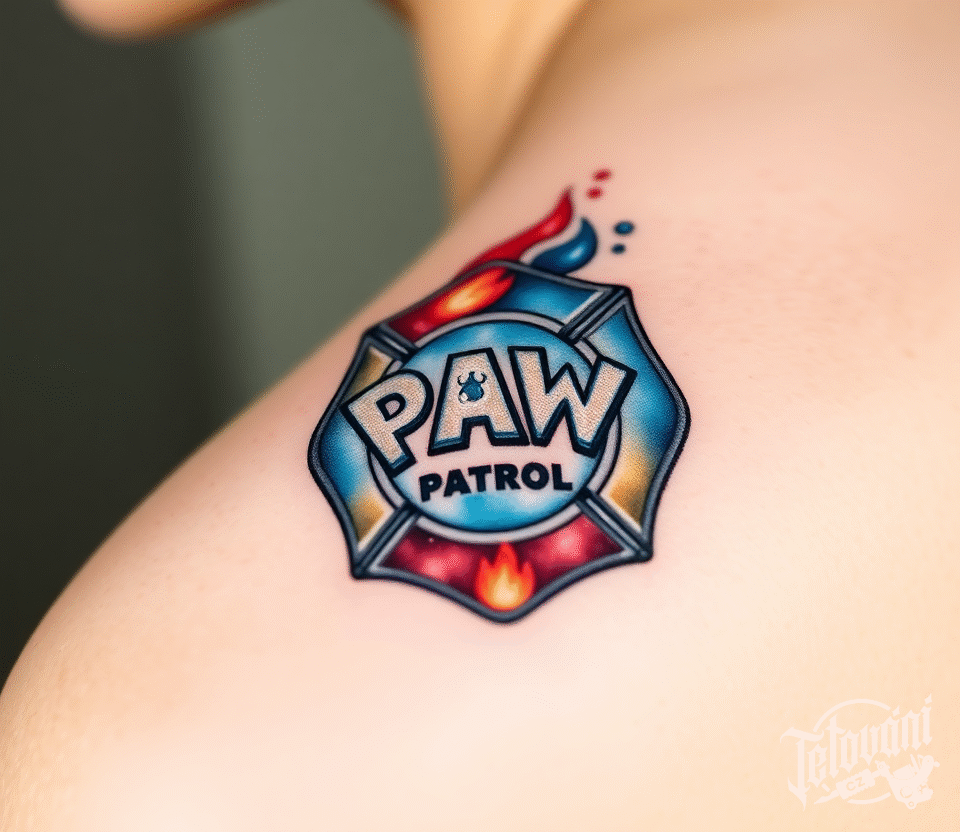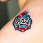 Tetování barevný nápis tlapková patrola z filmů a pohádek na rameno