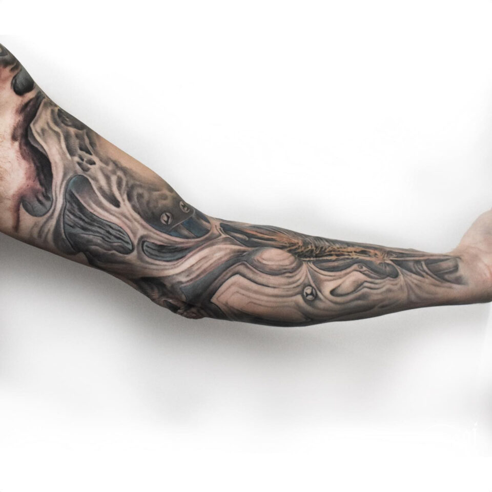 Tetování biomechanické čáry a tvary na ruku