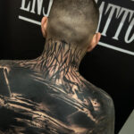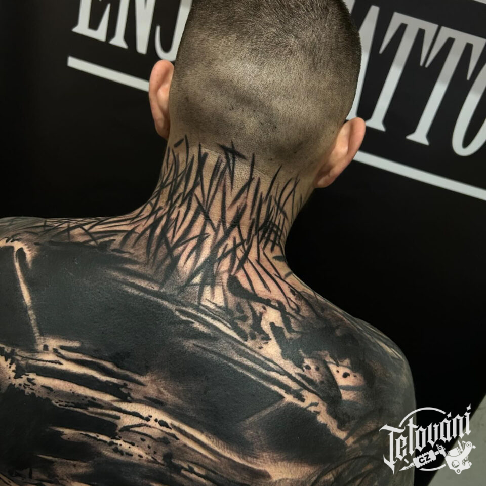 Tetování blackwork čáry a skvrny na záda a krk