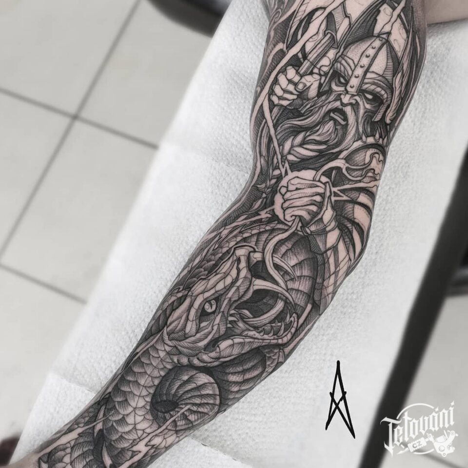 Tetování bojovní s hadem, rukáv