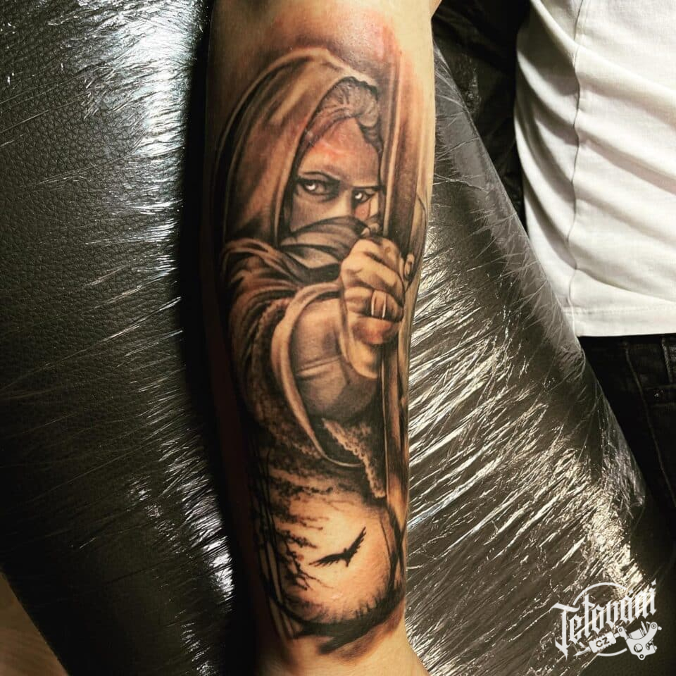 Tetování bojovnice na předloktí