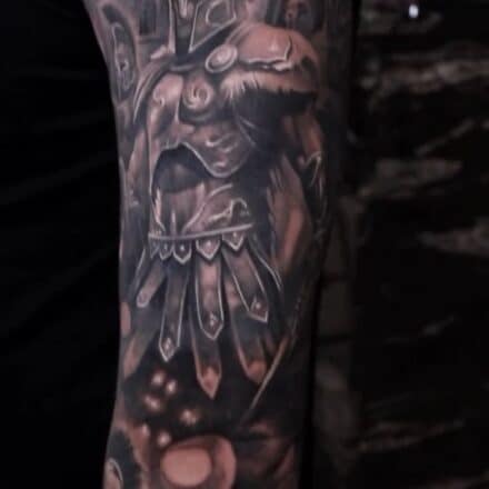 Tetování bojovnice na stehně