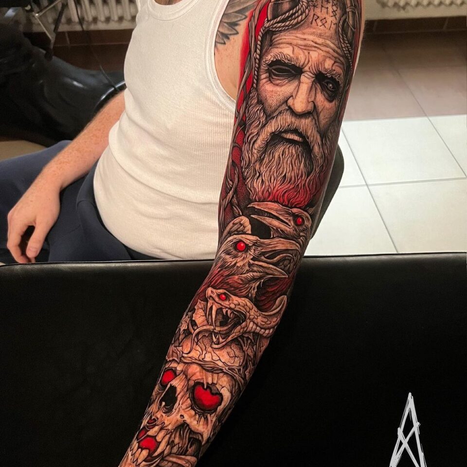 Tetování, Viking, lebka, ptáci, had, rukáv