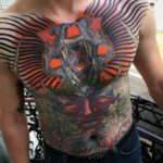Tetování Boží oko, lebka, portrét a znaky a symboly, čáry na hrudi a břichu