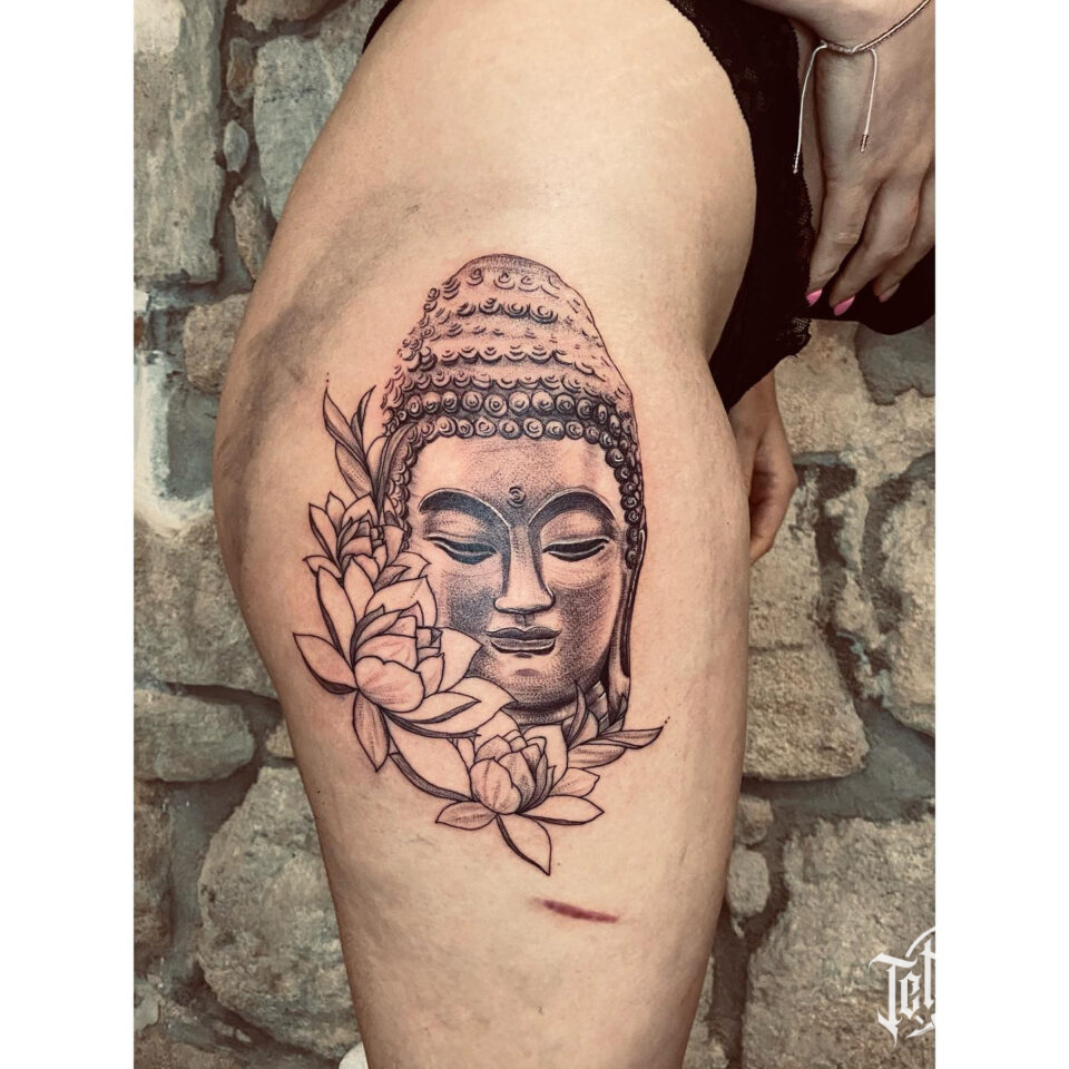 Tetování Buddha na boku stehna