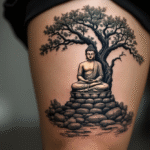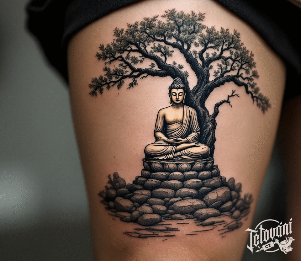 Tetování buddhistické znaky a symboly, Buddha a strom na stehně