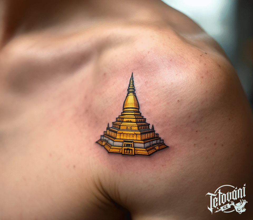 Tetování buddhistické znaky a symboly, chrám na rameni