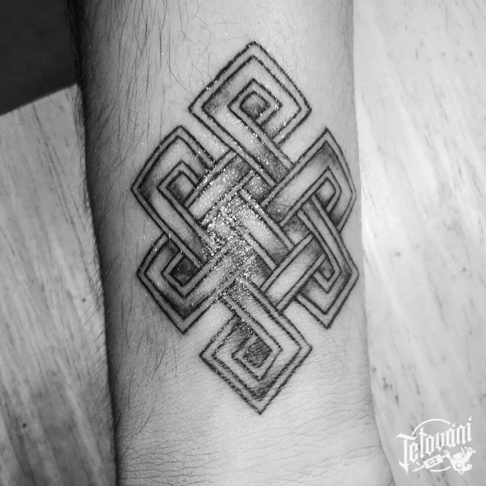 Tetování Buddhistické znaky a symboly, keltský znak, starověký uzel na předloktí
