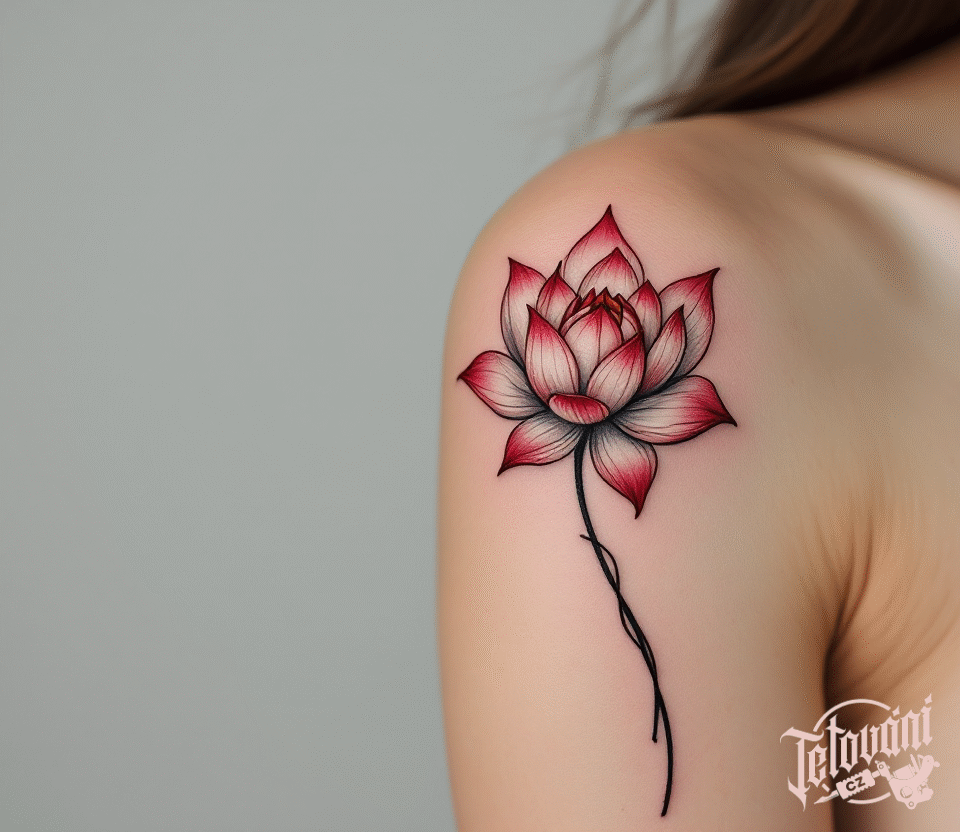 Tetování buddhistické znaky a symboly, květina, lotos na rameni