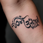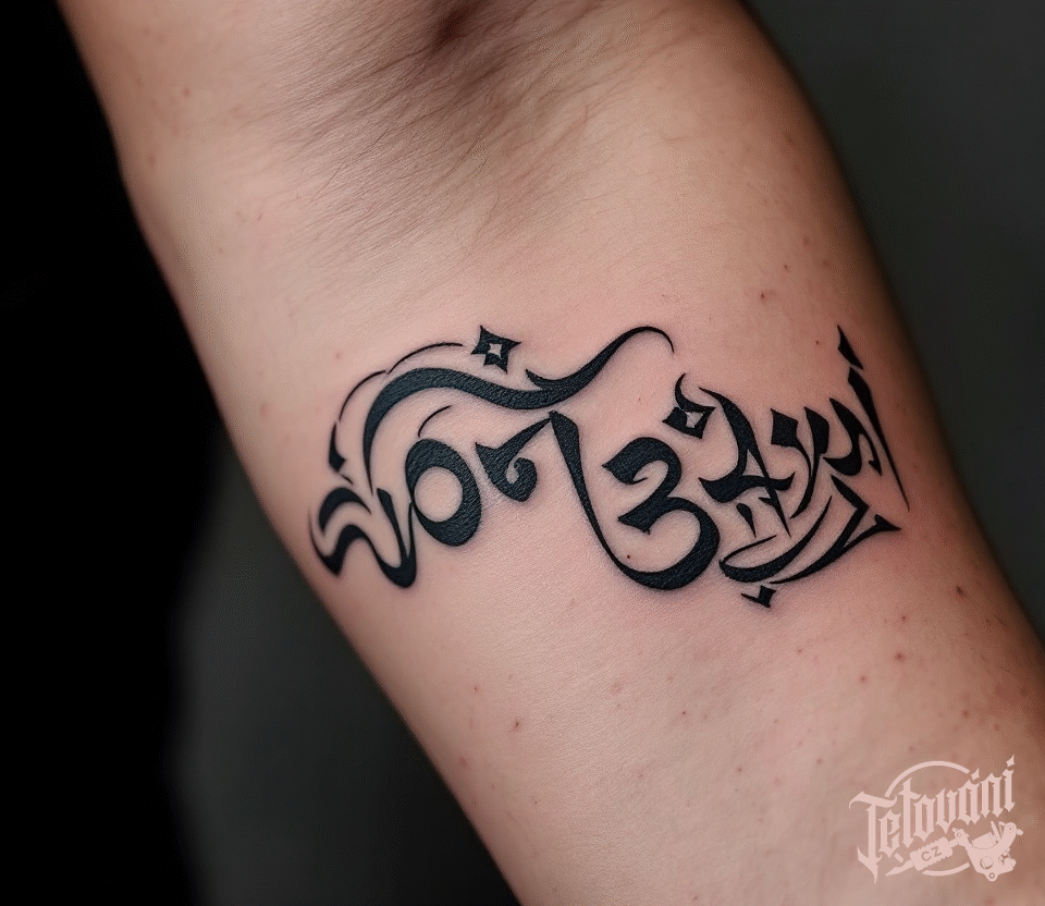 Tetování buddhistické znaky a symboly, nápis na předloktí
