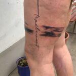Tetování čára, pruh, nápis s květinou na stehně