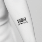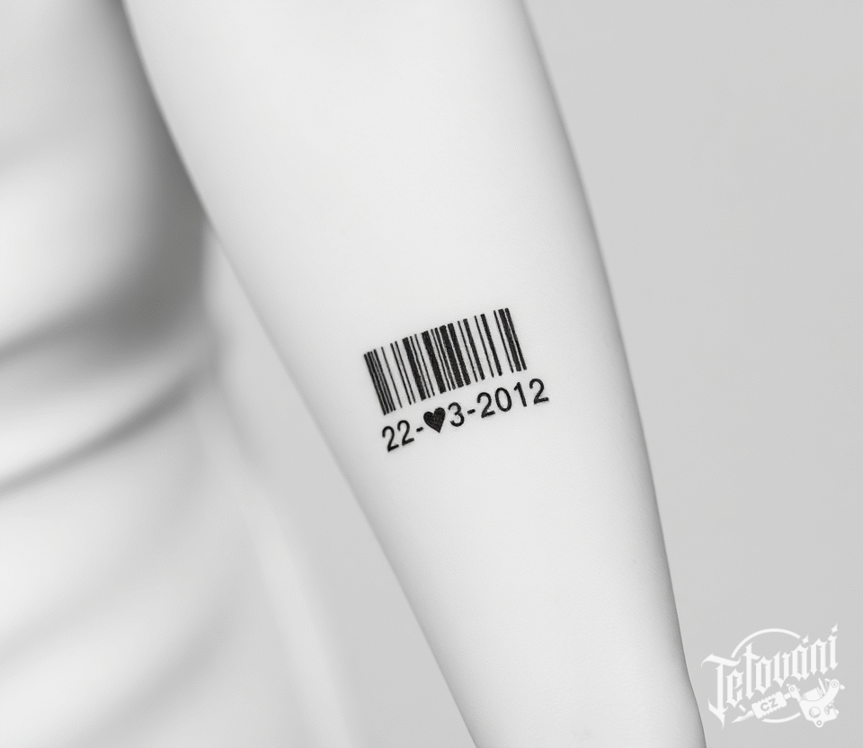 Tetování čárový kód s čísly a srdíčkem na předloktí