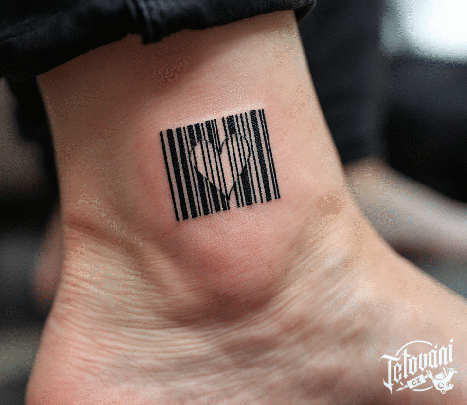 Tetování čárový kód se srdcem na kotníku