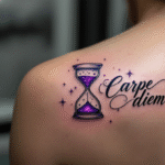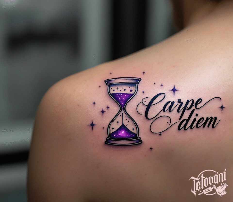 Tetování carpe diem a přesýpací hodiny na lopatku