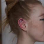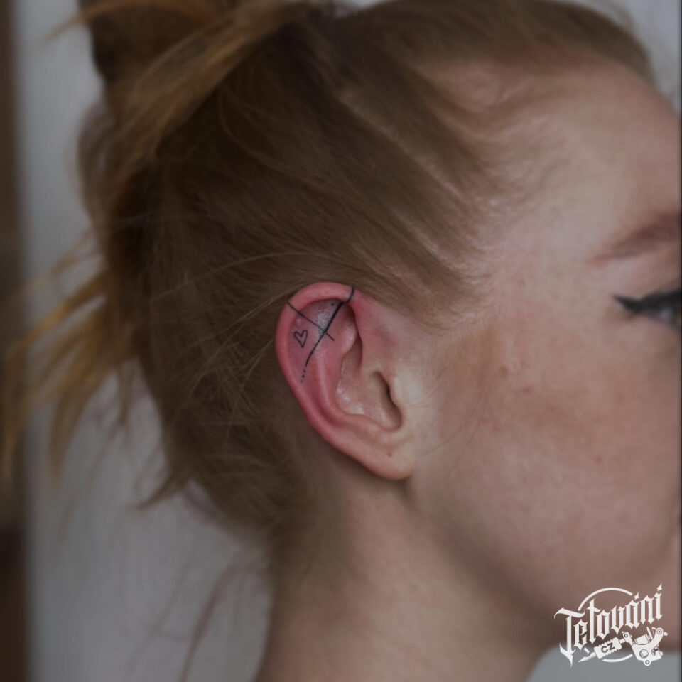 Tetování čáry a srdíčka na uchu